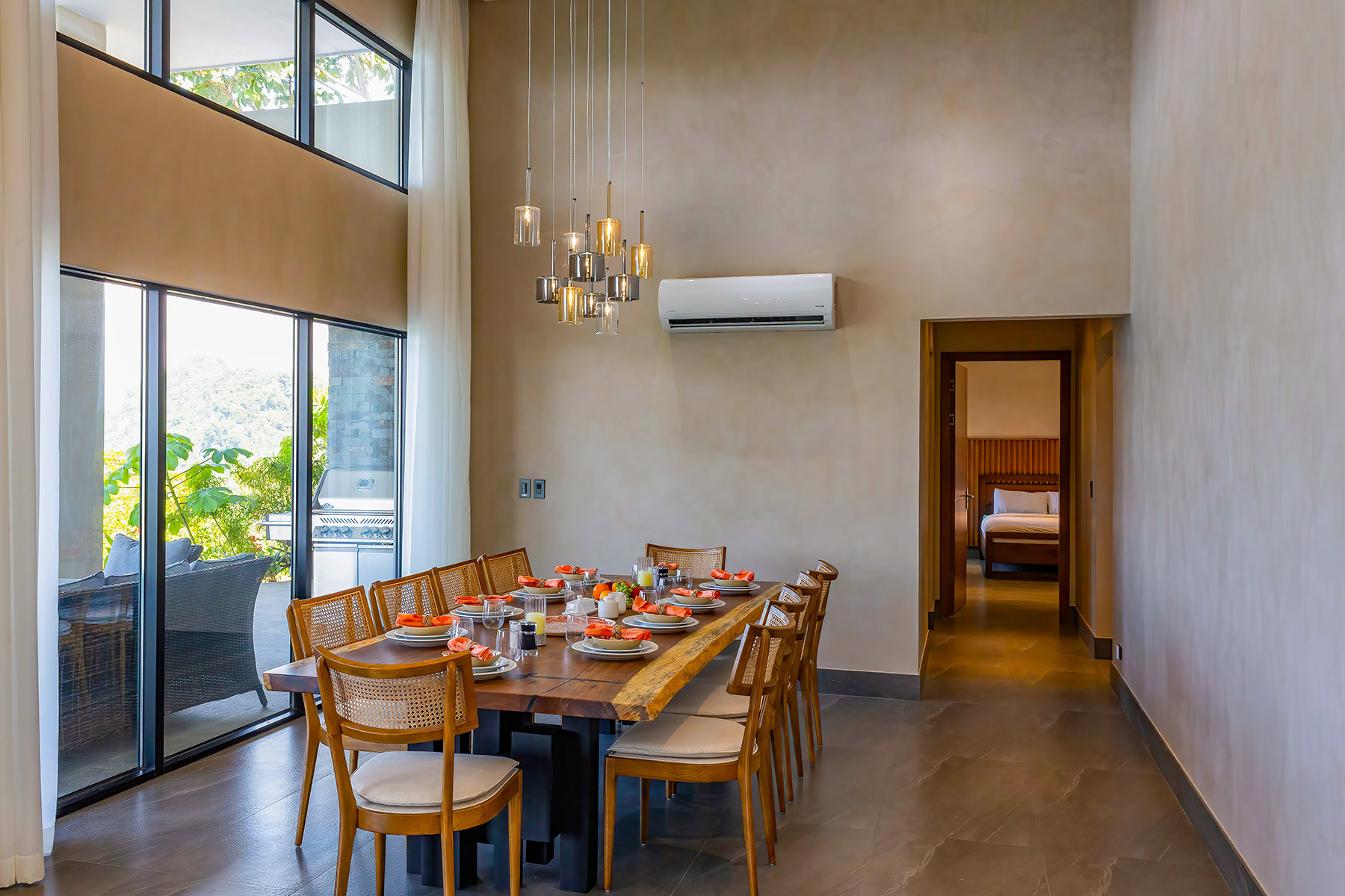 Just a short 45-minute drive south of Tulemar Gardens, Casa Vista Olas sits high above Dominicalito Bay, offering sweeping, panoramic views of the bay and the Pacific Ocean. Spanning 3,500 sq. ft., this stunning 5-bedroom, 4-bathroom home sleeps up to 12 people and blends modern sophistication with the natural beauty of its surroundings. Floor-to-ceiling glass walls flood the open living area with natural light, while high transom windows frame the lush landscape and endless horizon.