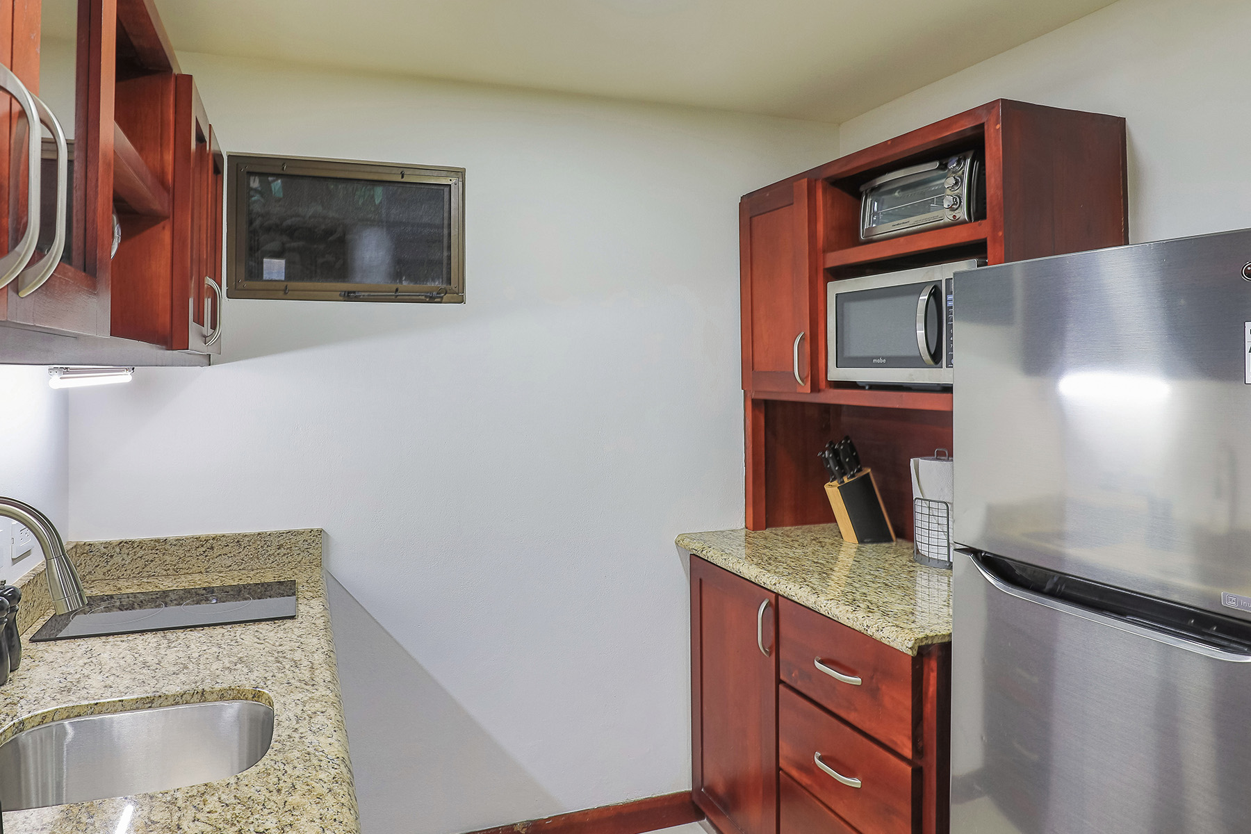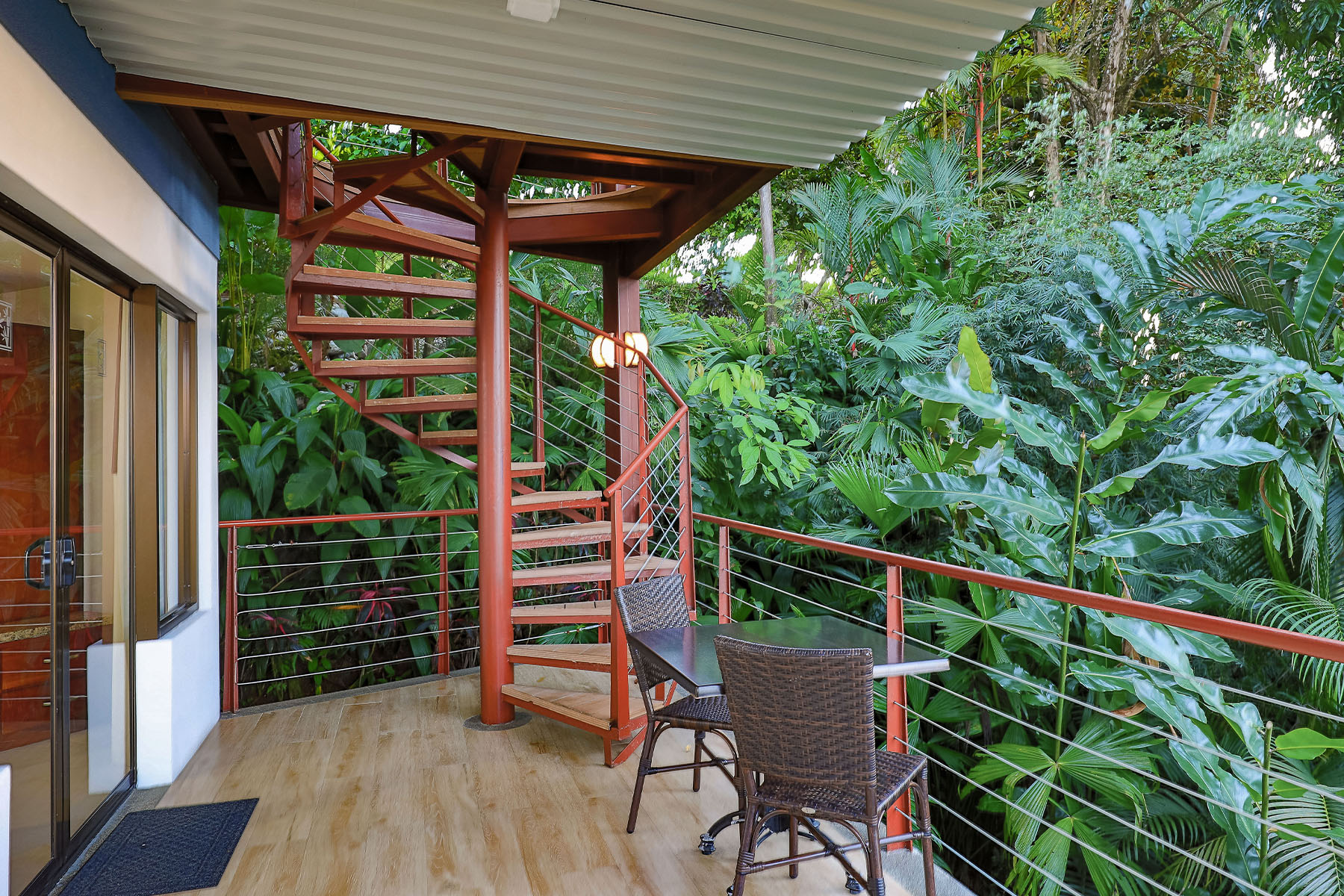 This free-standing vacation rental offers two levels, two bedrooms and two balconies. With private entrances on both the upper and lower levels, guests are assured an intimate experience. An exterior spiral staircase connects the two patios, allowing easy access to either level. Whether you wish to enjoy the natural breezes or an air-conditioned escape, comfort is assured is this well appointed and newly renovated bungalow.