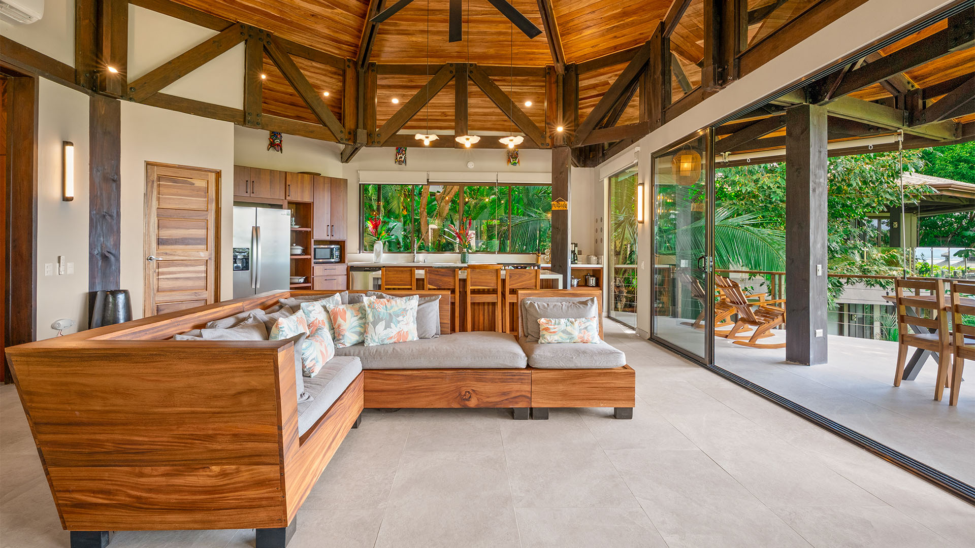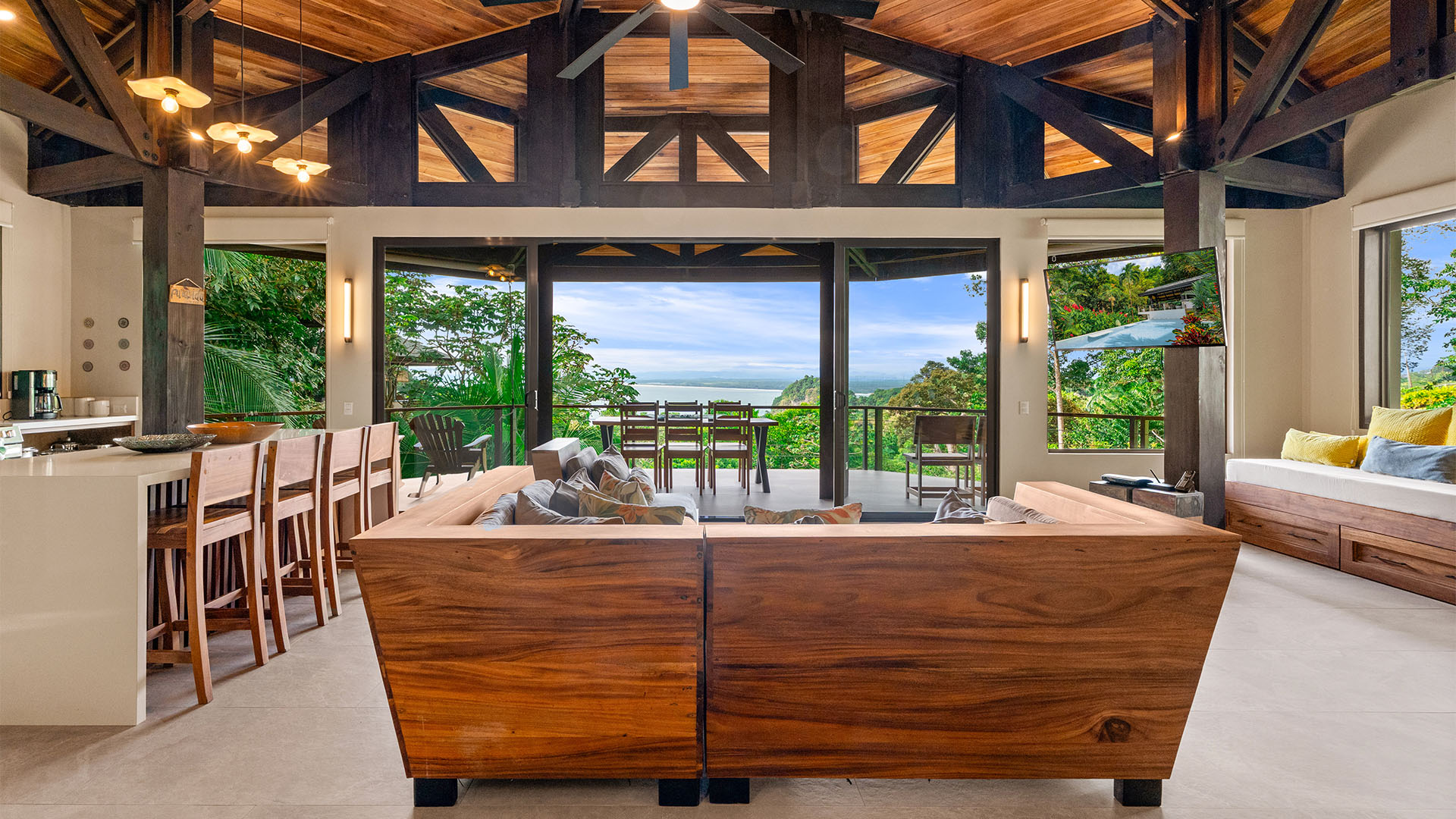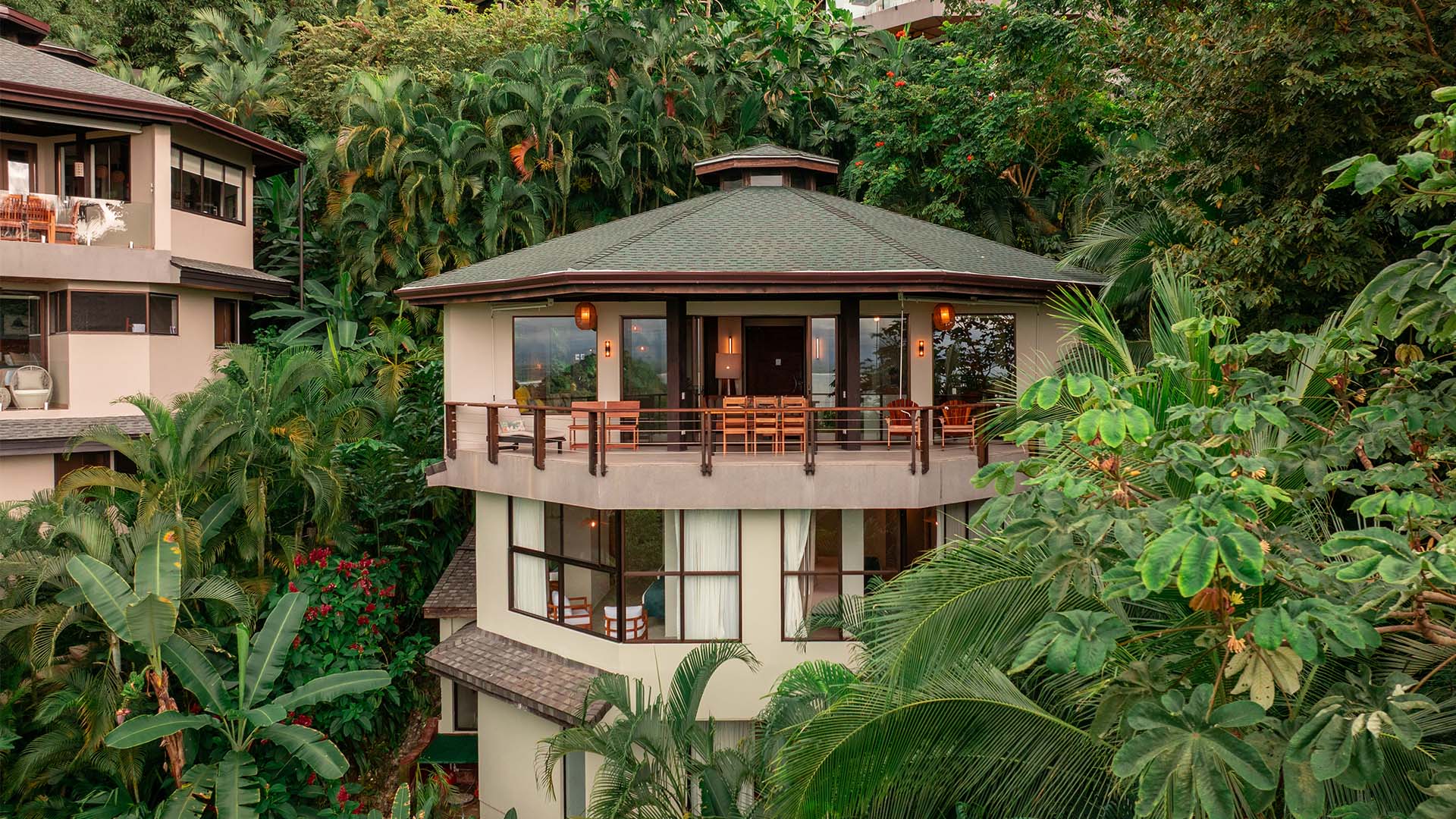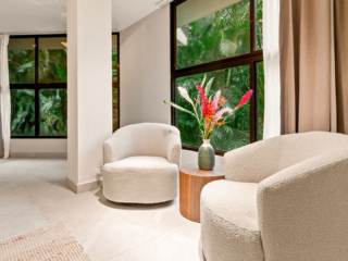 This 3-bedroom, 2,900 sq ft octagonal villa is fully equipped with all the luxuries you could ask for, including a gourmet kitchen, spa-like bathrooms, and 8-foot glass doors that open to your private veranda with lounge chairs and views of Manuel Antonio’s iconic jungle hillside and coastline.