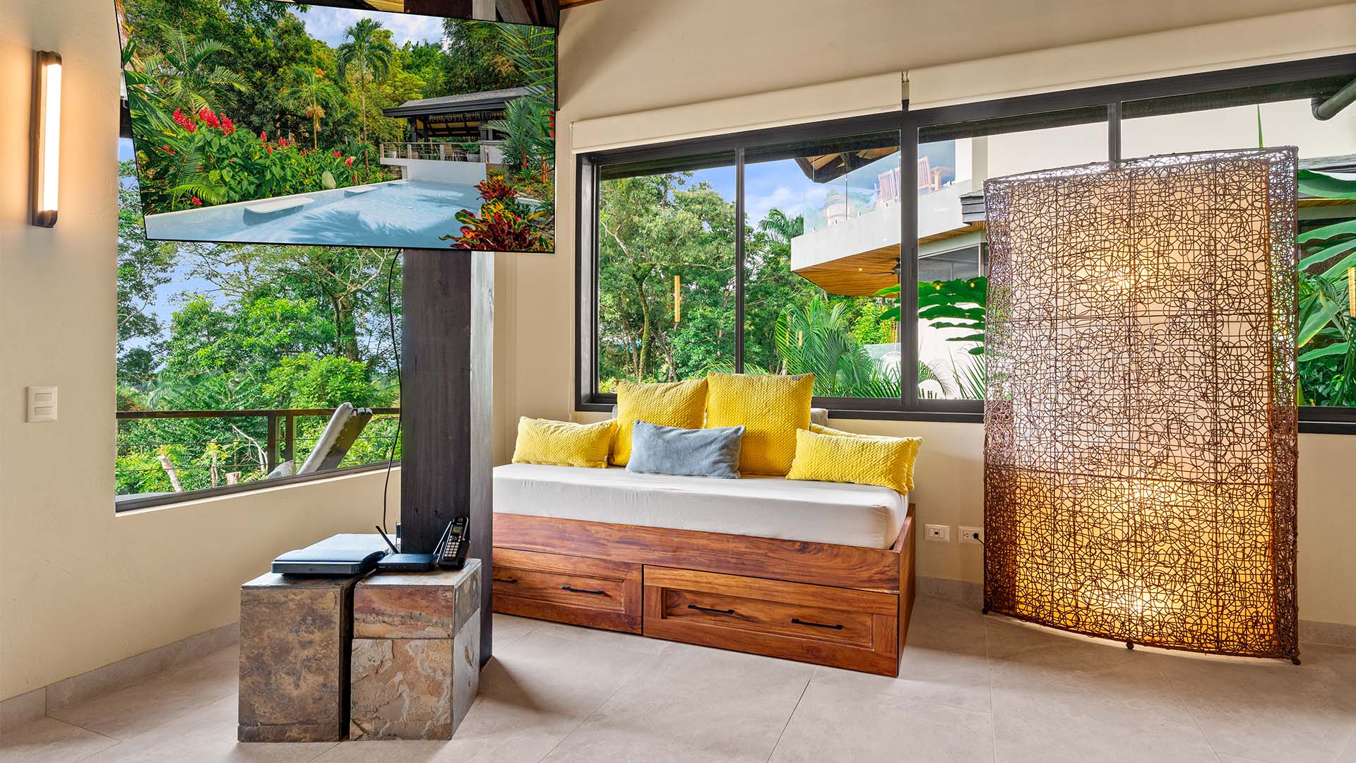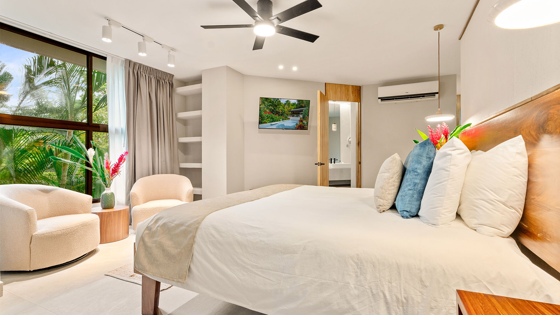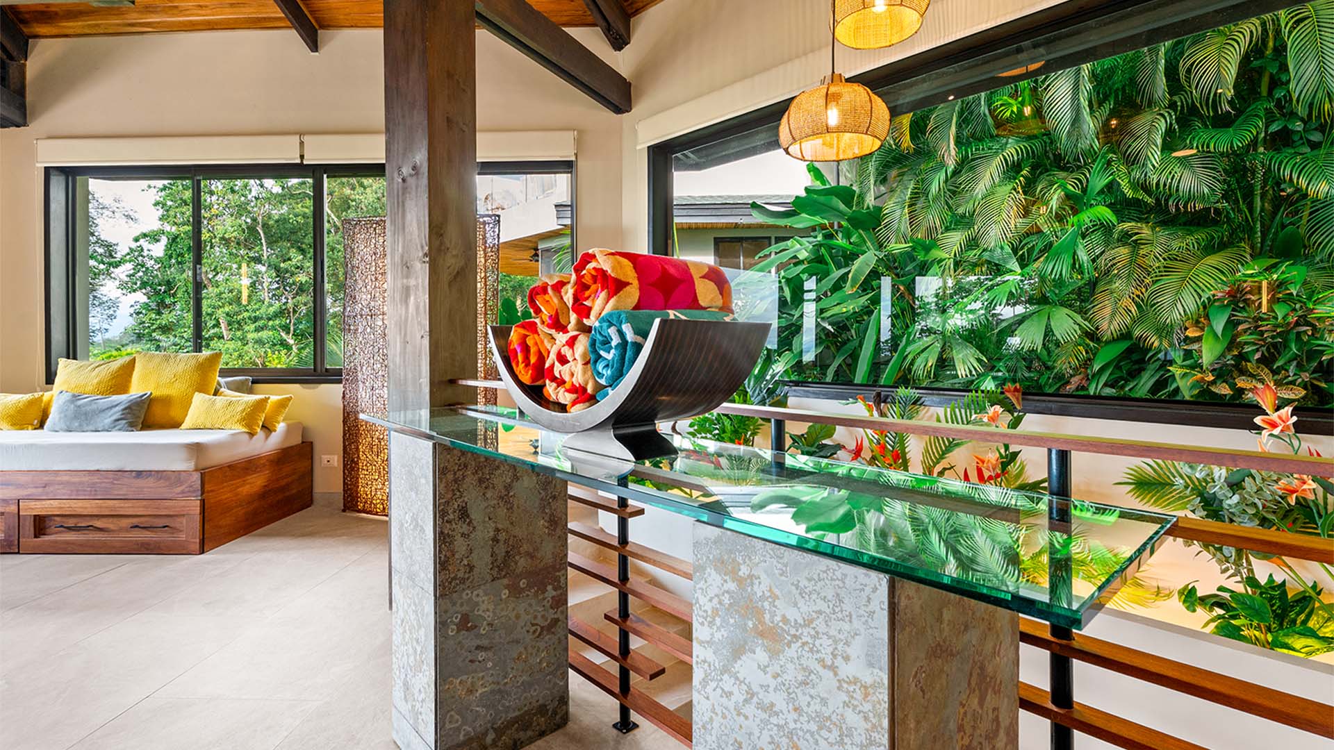 This 3-bedroom, 2,900 sq ft octagonal villa is fully equipped with all the luxuries you could ask for, including a gourmet kitchen, spa-like bathrooms, and 8-foot glass doors that open to your private veranda with lounge chairs and views of Manuel Antonio’s iconic jungle hillside and coastline.