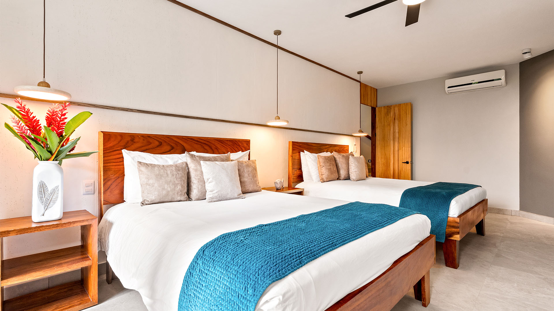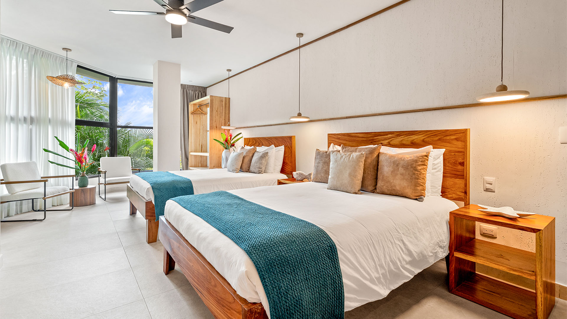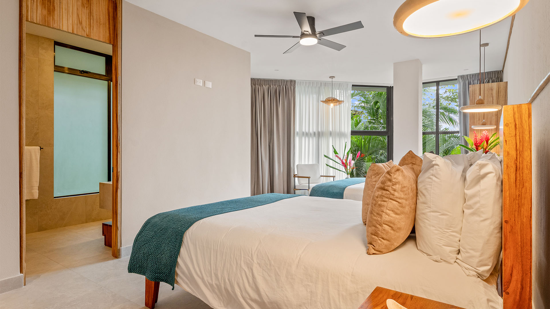 Casa Quivira is the perfect accommodation for groups of up to 10 guests, with a primary suite featuring a king bed, a second bedroom with two queen beds, and a third bedroom also fitted with two queen beds. Safes are provided in each bedroom closet. Each bedroom offers a private ensuite bathroom with a walk-in shower, ensuring comfort, privacy, and convenience for all guests. For further accommodation, there is also a day bed in the main living area.