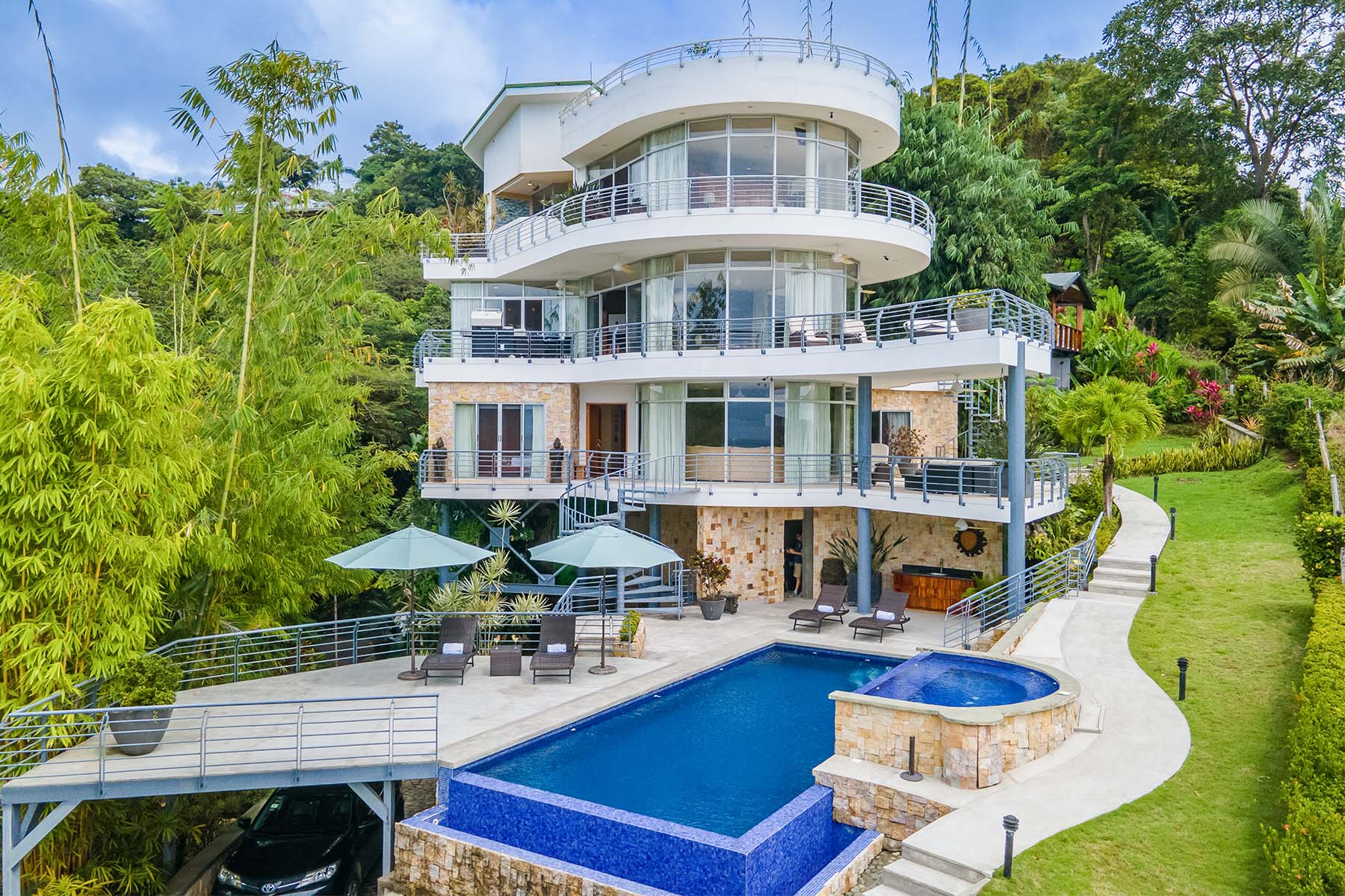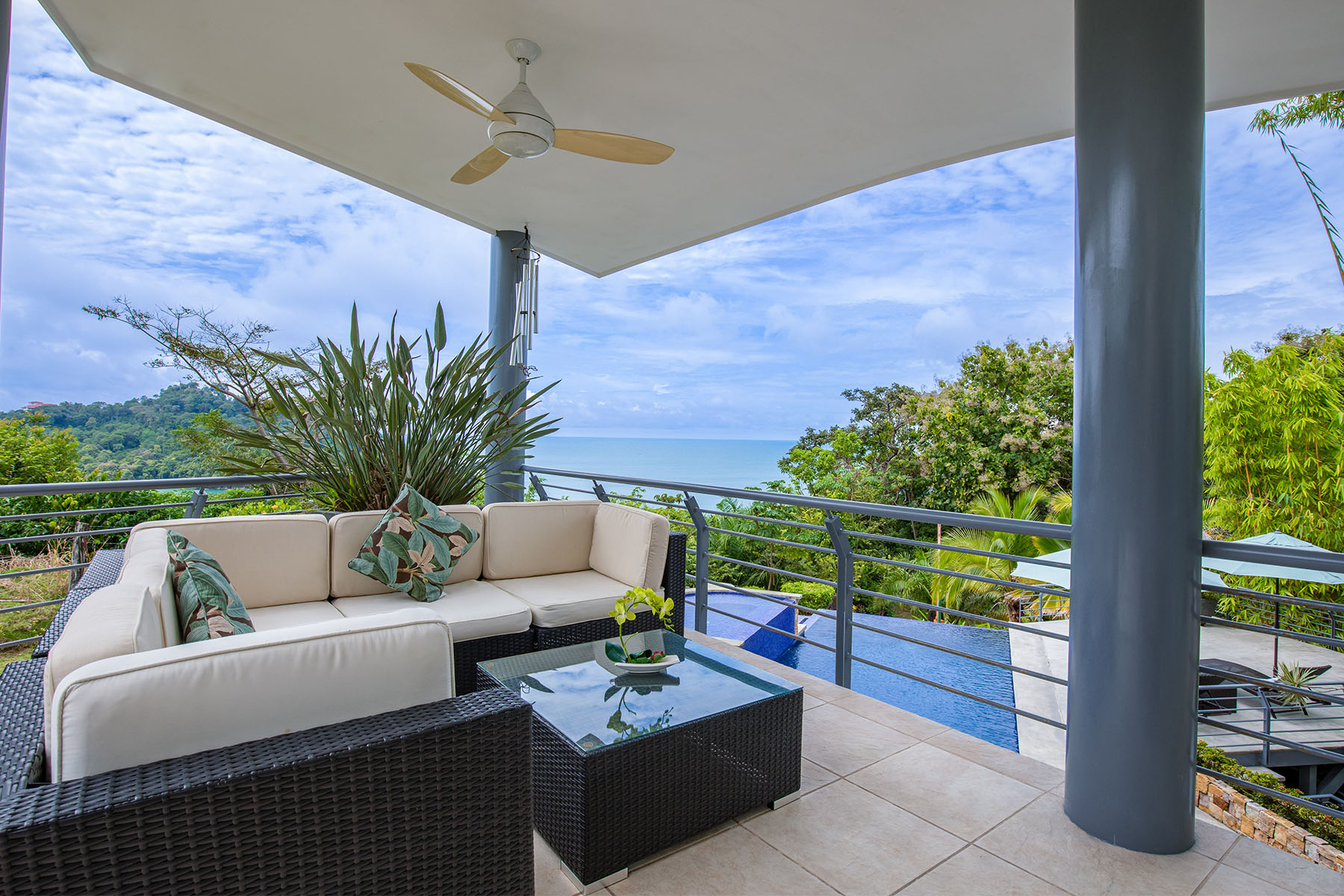 With unrivaled views of the Pacific, this multi-level, 4,000-square-foot hilltop jungle palace features 4 bedrooms and 3.5 baths, comfortably accommodating up to 9 guests. The open-air architecture and earth-to-sea-inspired, handcrafted interior immerses you in a stunning panorama of the ocean and rainforest. True to its name, palm trees surround you, making relaxation effortless on the sunny decks and patios, or in the sizable private pools.